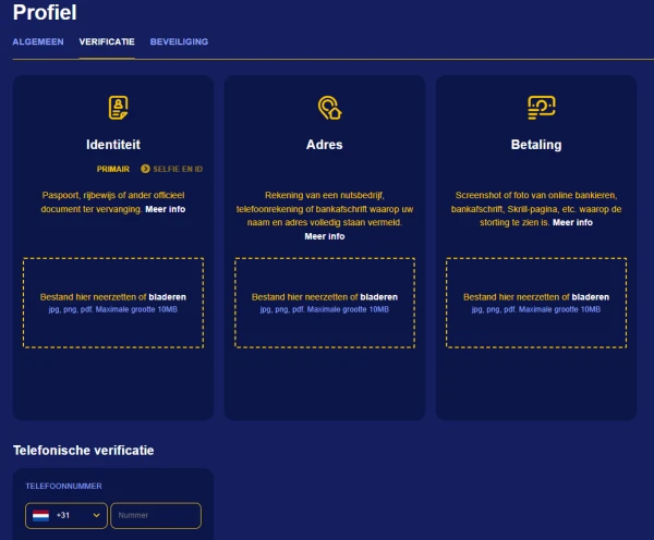 Verificatie is onderdeel van verantwoord accountbeheer en betaalveiligheid bij casino Koning. Onze KYC-controles kunnen bestaan uit een officieel ID (paspoort of identiteitskaart) plus een selfie met het ID, een adresbewijs (energierekening of bankafschrift; mobiele telefoonrekeningen worden niet geaccepteerd) en een bewijs van betaalmethode (bijvoorbeeld een kaartfoto of een e-wallet-screenshot). De KYC-doorlooptijd is tot 48 uur. Na verificatie kun je met je gegevens Koning inloggen en toegang krijgen tot de cashier, bonussen en wedgeschiedenis.